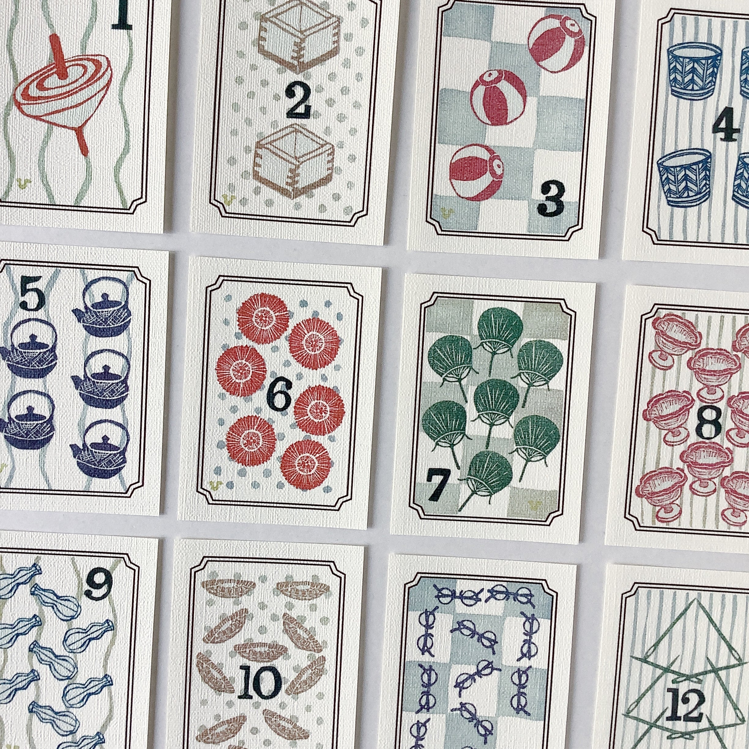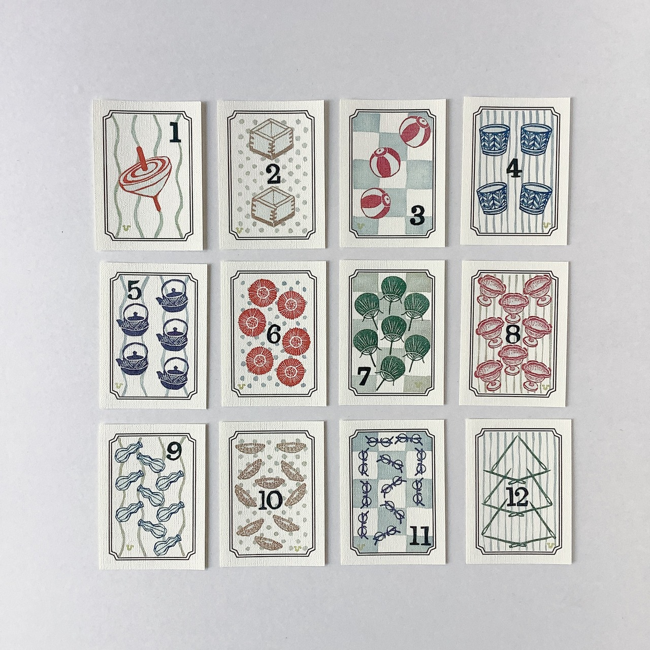1月 独楽と紐、2月 枡と豆、3月 紙風船と障子、4月 蕎麦猪口とそば、