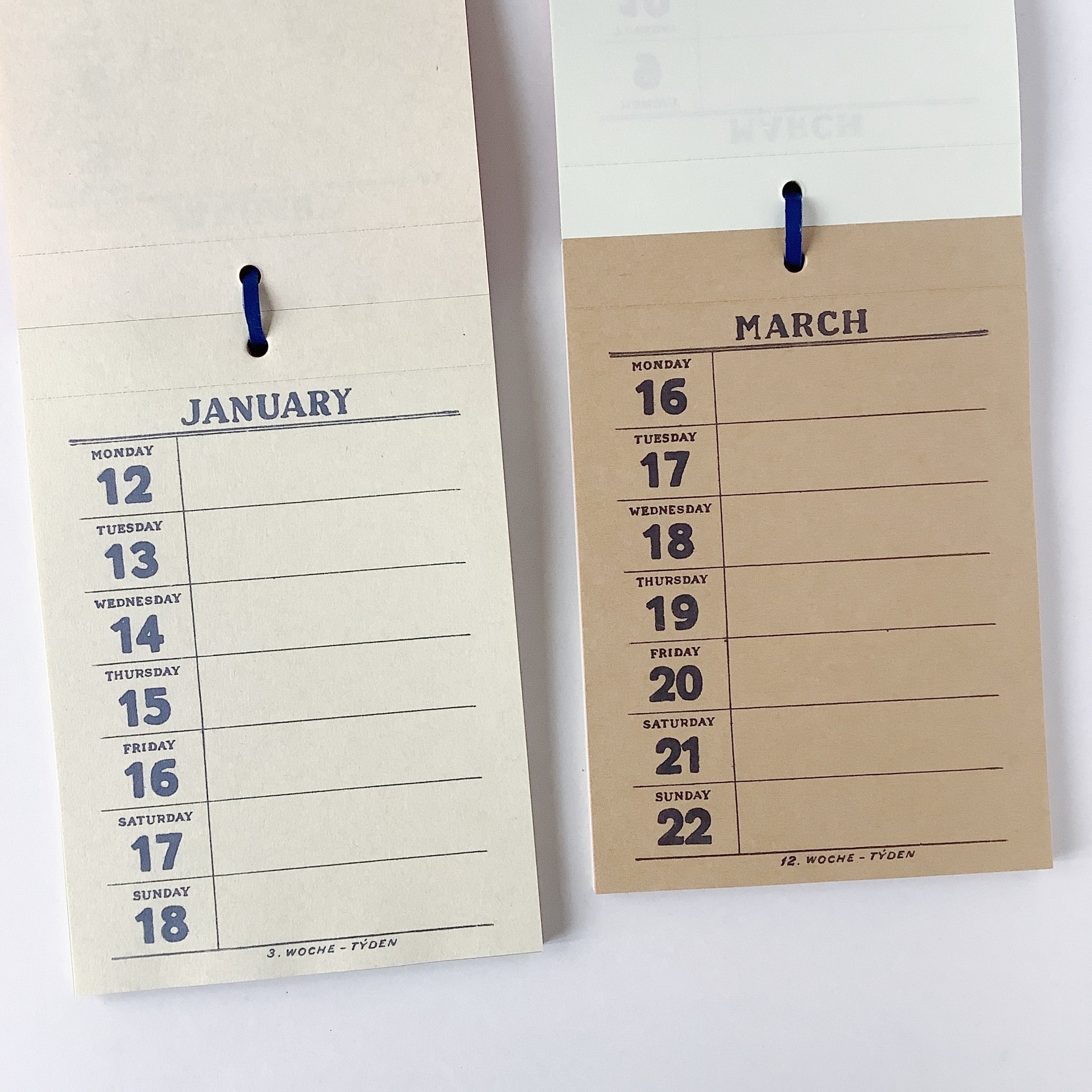 チェコの1945年のカレンダーから拾った書体を組み合わせた雰囲気もある実用的なカレンダーです。革紐付きなので、壁にかけてもお使い頂けます。