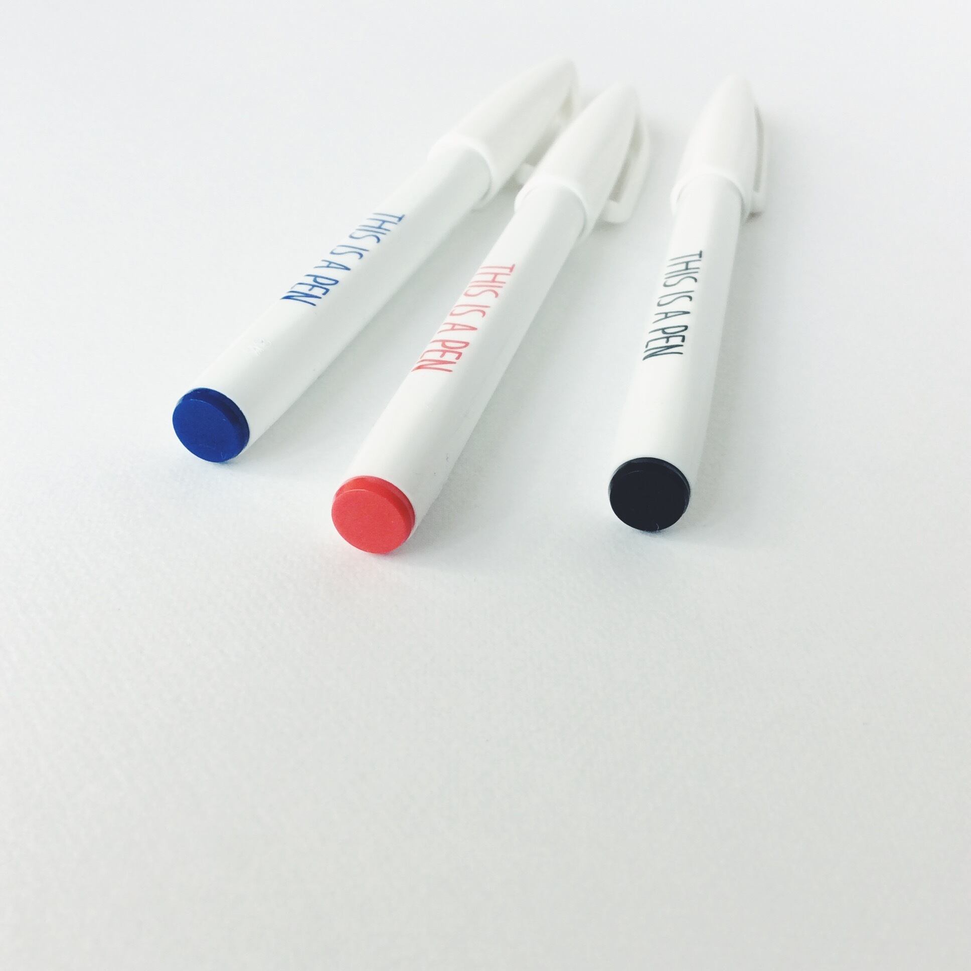 ぺんてるの別注白軸のサインペンに「THIS IS A PEN」と手描き