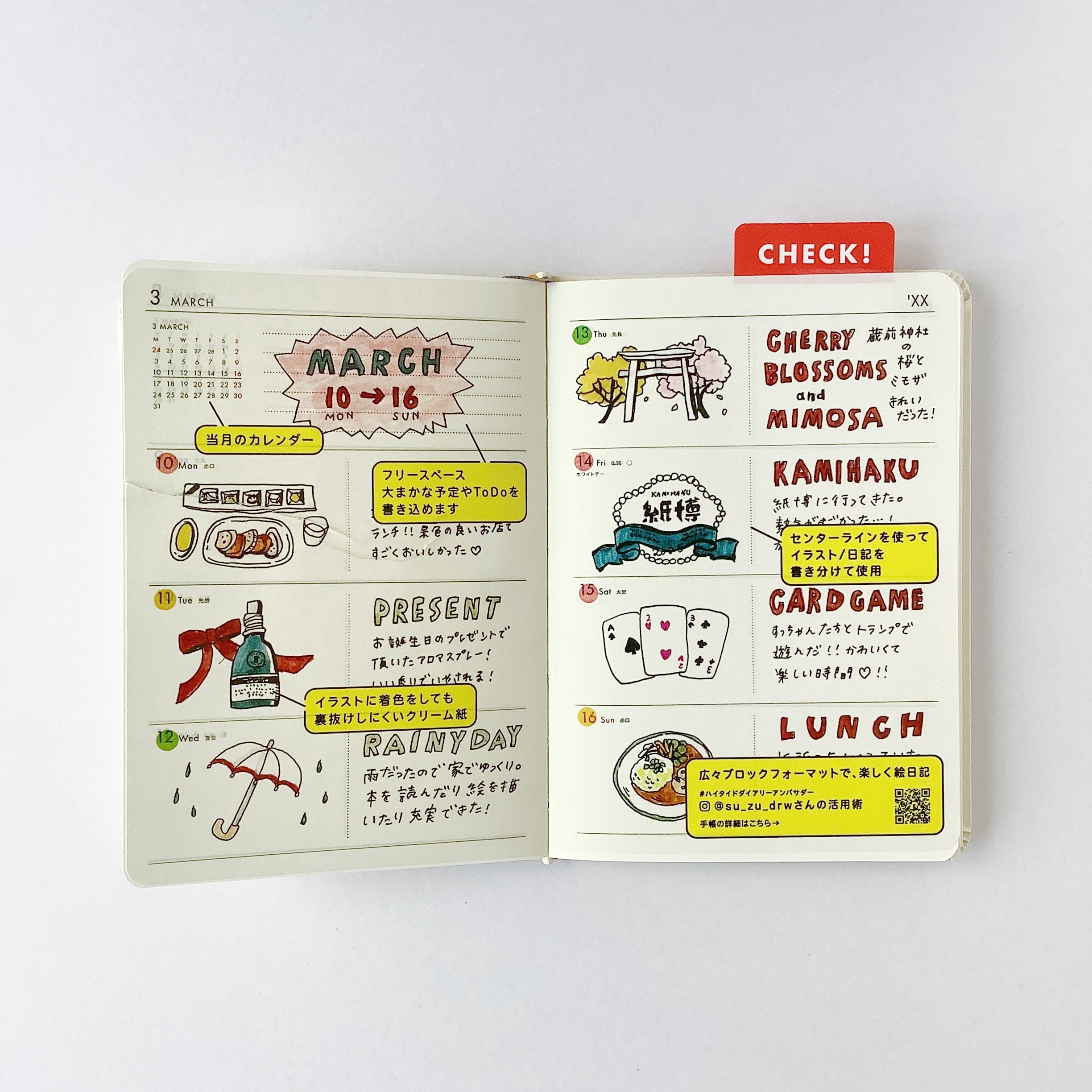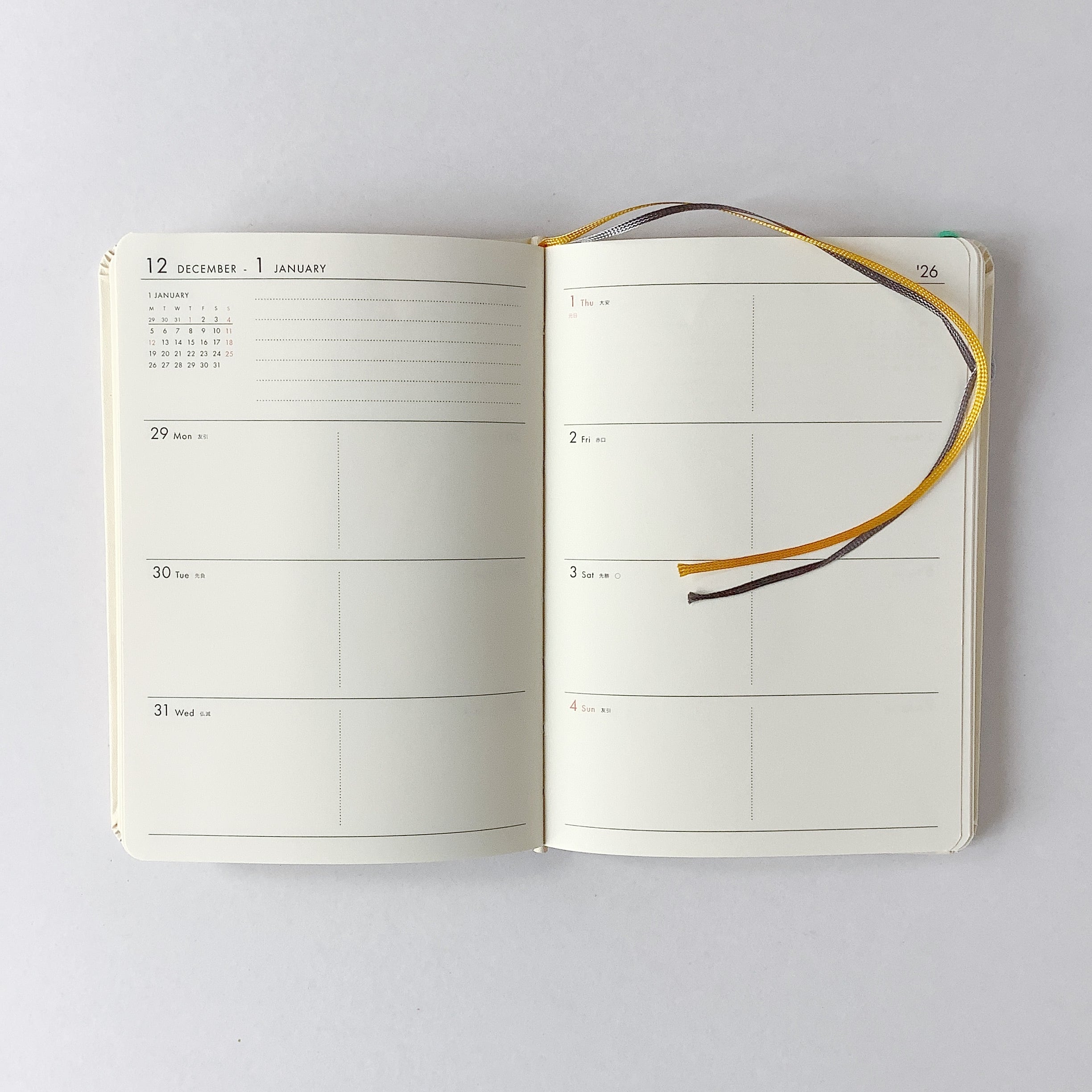 フォーマットは見開き1週間のブロックタイプ、シンプルな構成なのでお好きなようにアレンジしてご使用頂けます。日記帳としてもおすすめです。