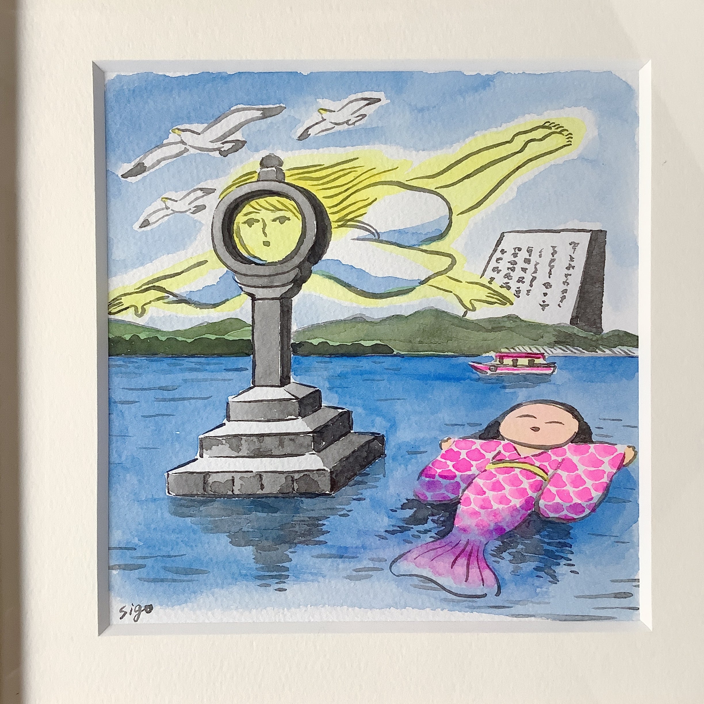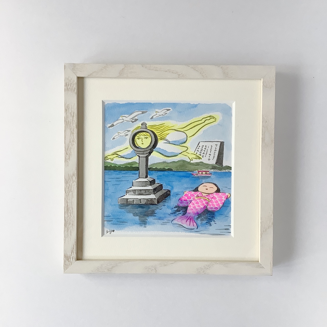 イラストや漫画、絵本など様々な媒体で活躍しているイラストレーター死後くんの2026年のカレンダー、3月の原画作品です。
